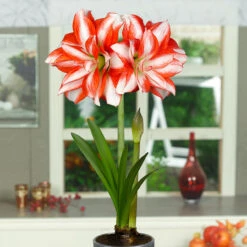 Beautiful double flowering Amaryllis with red and white bi-colour flowers that really are unusual. Amaryllis are the ideal choice for a festive display making excellent pot plants. They will produce three to four funnel-shaped florets of 20-25cm wide at the mouth, carried on a strong stiff stem. Plant in large pots of potting soil and put in warm place near radiator or fireplace and water sparingly until the first signs of growth. 26cm+ Bulbs are supplied.