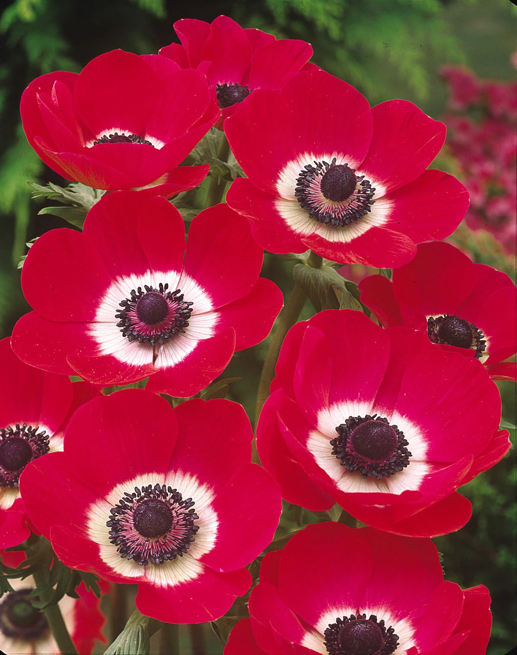 Hollandia is a bright cherry red variety of Anemone De Caen. Perfectly formed cup-shaped flowers stand on 30cm green stems. The contrasting black central ball in the centre of the floweris surrounded by a brilliant white border. A gorgeous addition to any garden and flowers between April-May. Perfect for brightening up the patio in pots and containers in addition to being used asground cover in the garden borders with their lush foliage creating a dense carpet. Supplied as 5/6cm bulbs.