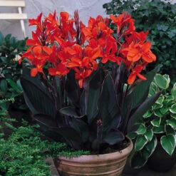 Cannas are an excellent perennial that will add plenty of exotic colour to your garden borders, beds or containers. They thrive in sunny areas and will display vibrant flowers from July to October. Canna Delibab is a dwarf variety that is perfect for fans of traditional Canna but want something more compact. They produce fantastic dark purple leaves, complimented with beautiful orange flowers that appear in summer. Height 50cm. Top quality tubers supplied.