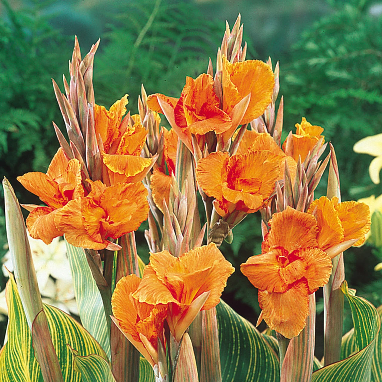 Cannas are an excellent perennial that will add plenty of exotic colour to your garden borders, beds or containers. They thrive in sunny areas and will display in late summer some fantastic dark variegated leaves, complimented with orange flowers.