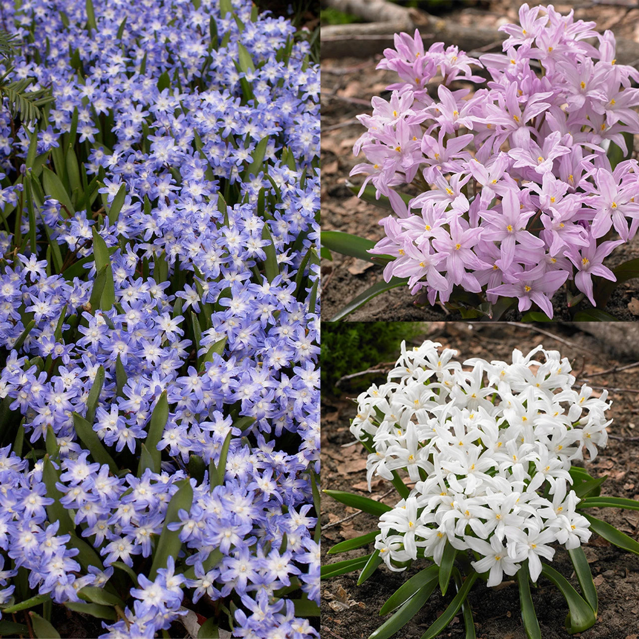 Chionodoxa are pretty small flowering bulbs that create up to 10 flowers per stem. Planted in clumps they are great for the front of a border, rockeries or patio pots and containers. The collection consists of 50 each of Luciliae, Luciliae Alba and Luciliae Rose. 4cm+ bulbs supplied.