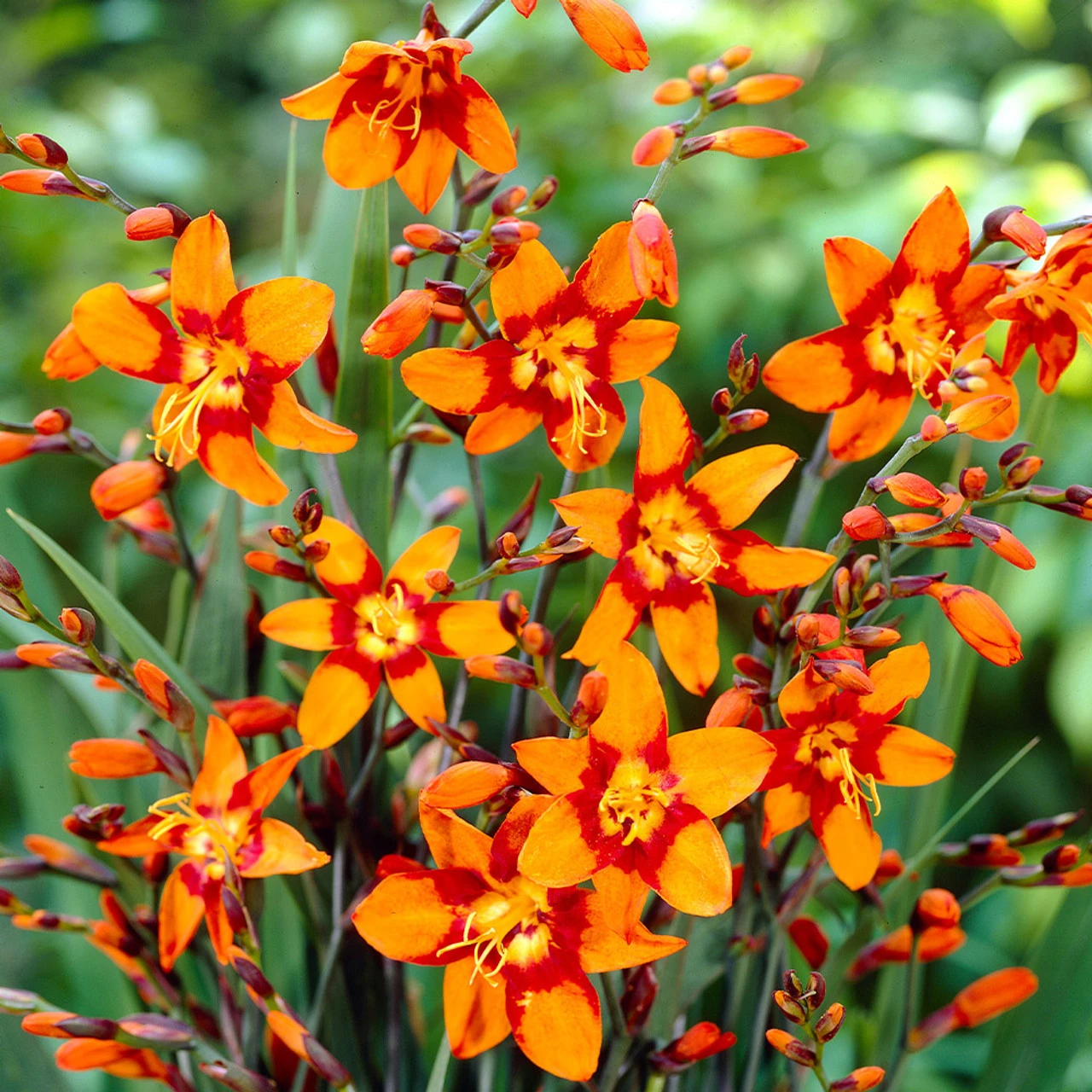 Our Crocosmia Collection (Large Flowering) provides a selection of fiery reds, oranges, and yellows that are sure to brighten up even the darkest of patios or borders. Ideal for pots or planting in groups around the border. Each bloom creates sword-shaped mid-green leaves that creates the perfect contrasting backdrop for the masses of vibrant funnel-shaped flowers. This collection includes 10 each of Crocosmia Emily McKenzie, Sunglow and 20 of Lucifer.