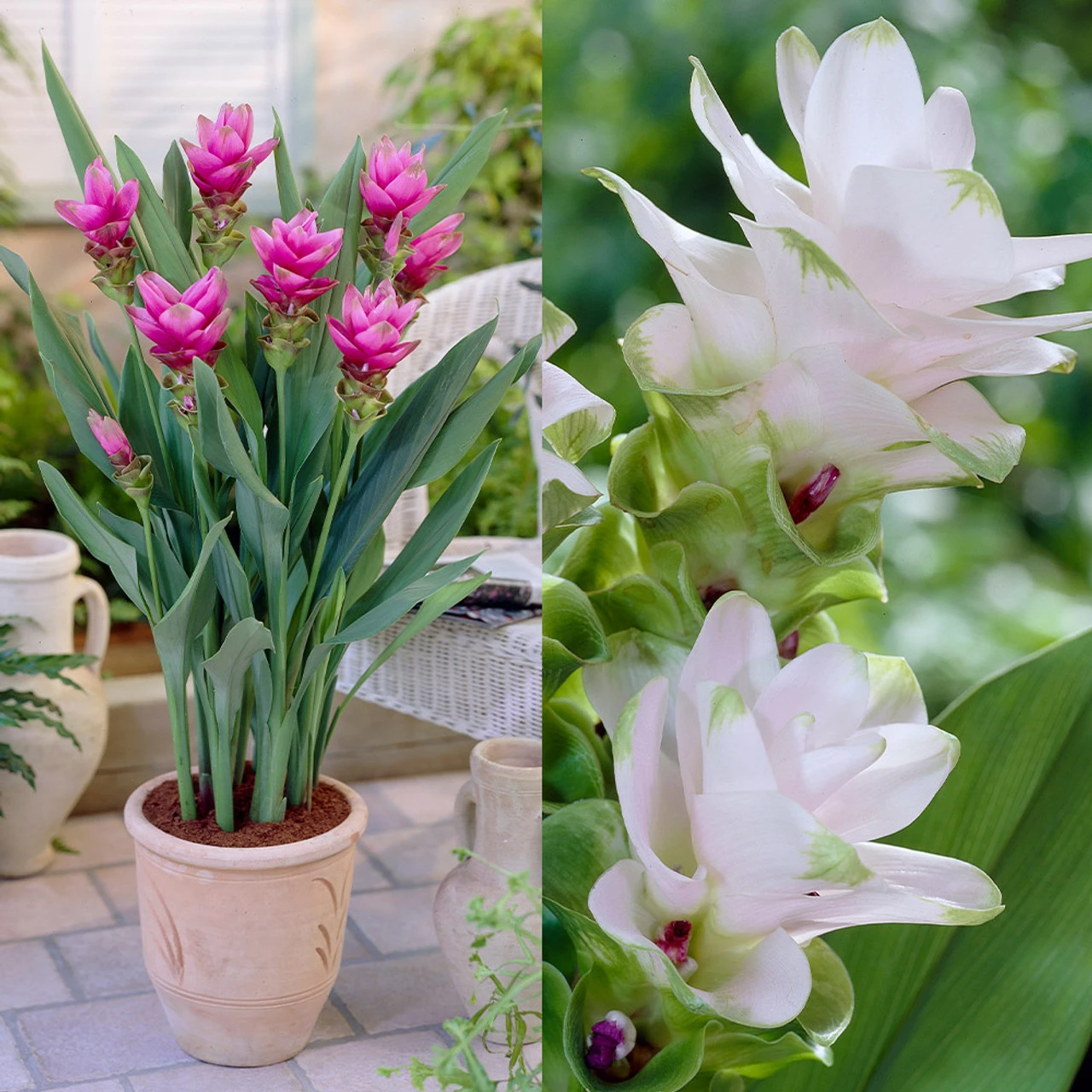 Curcuma alismatifolia Collection provides seasonal blooms for less. Perfect for companion planting. Great for the border or a large container. This collection includes 1 each of Curcuma alismatifolia White and Pink.
