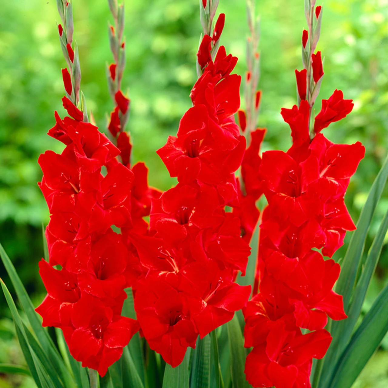 Plant gladioli corms about 10-15cm deep and about 10-15cm apart, in fertile/well drained soil in spring. Planting can be done in succession from early March onwards to the end of May at fortnightly intervals. This ensures a continuity of flowers throughout the summer months. When planting in a heavy soil, place some sand underneath each corm to help with drainage. You can water regularly as the growth begins to appear and you can dead head when flowers begin to die off, though make sure to leave foliage to grow throughout the summer. In late autumn when frosty and cold nights are likely to return, you should lift and dry the corms and store over the winter in a frost free shed/garage until ready to plant again next year.
