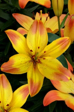 Lily bulbs will greatly appreciate the shelter of low growing shrubs or other plants near their roots. In active growth, apply water freely a high potash liquid fertilizer every two weeks or so. When planting, each bulb should surrounded with a little sharp sand both under and above the bulb to keep slugs away and to ward off excessive wetness. As most lilies are stem rooting, we strongly recommend you plant about 15cm deep. They give a much better display when planted in clumps of 3, 6 or 12 bulbs, spaced 45cm apart. Plant from December to April to see them appear in summer.
