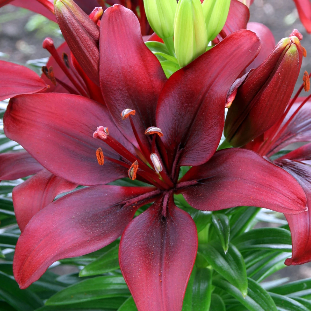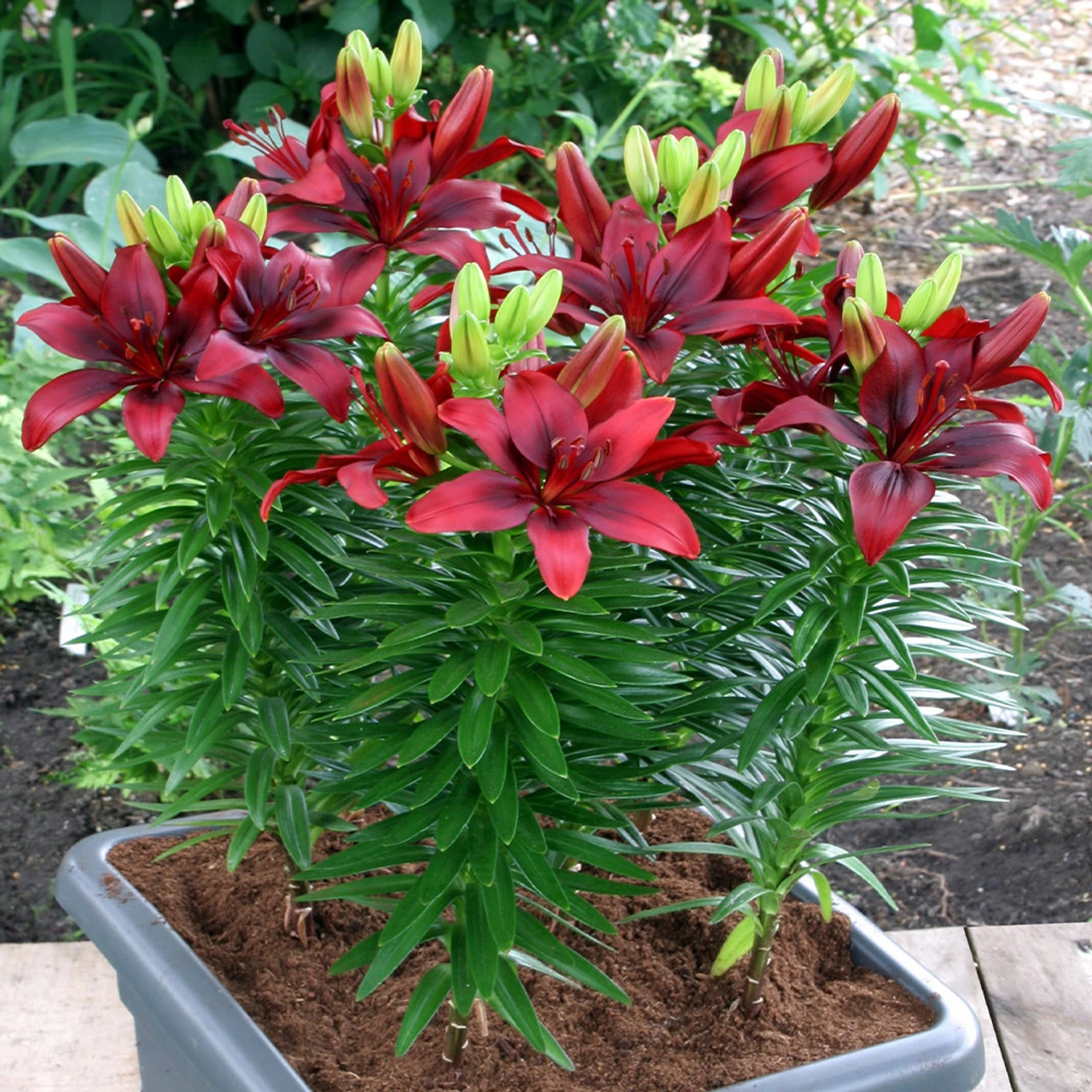 Lilium Happy Love produces tall blooms in shades of deep maroon-red. Perfect for border or container planting. Can be used as cut flowers.