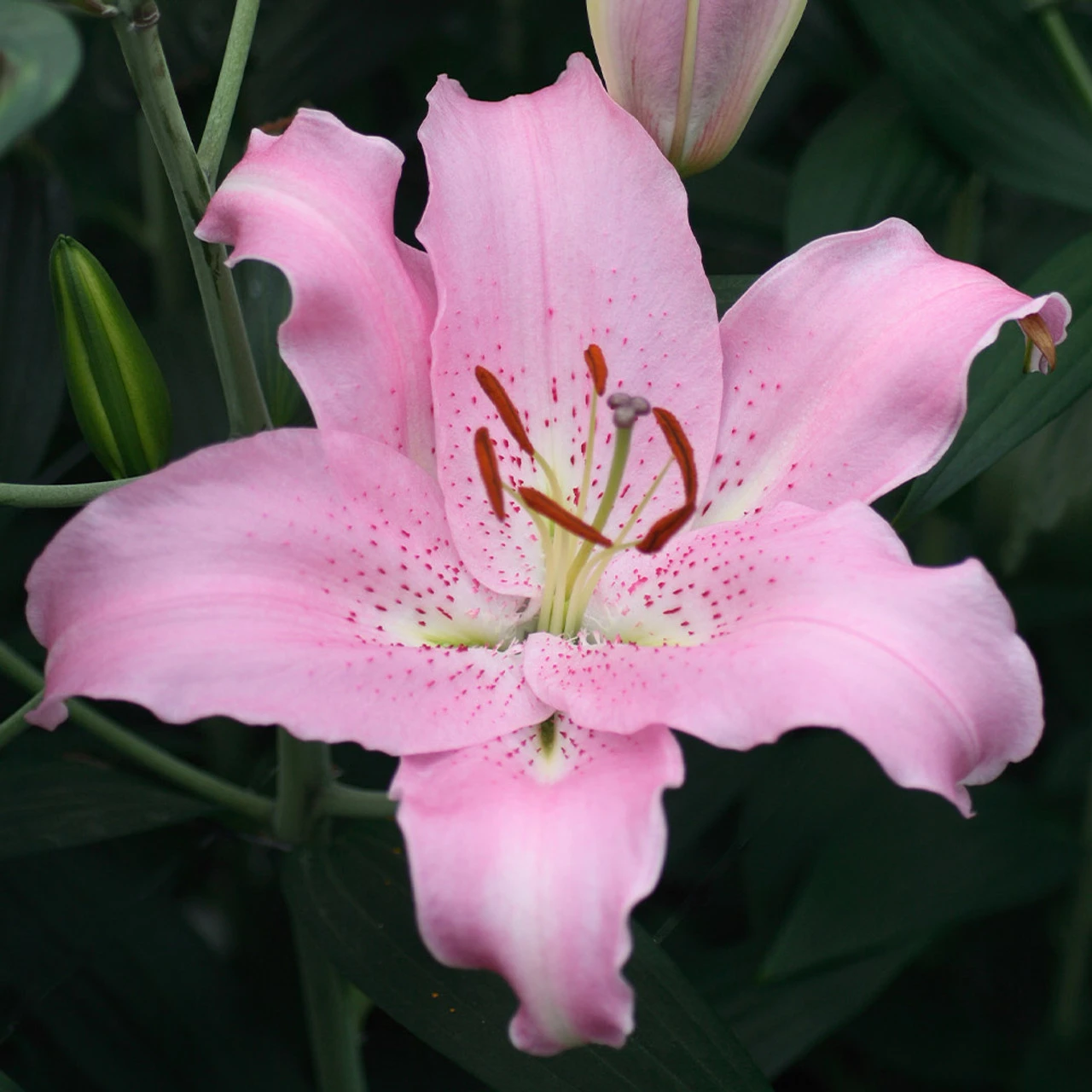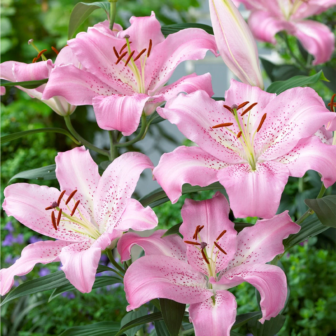 Lilium Josephine produces speckled pink flowers with a lighter inner petal. Planted in the right location Oriental lilies can be left undisturbed and will flower for up to eight weeks in August-September. Josephine’s height 100-120cm makes it the ideal choice for the back of the border, and it’s spicy fragrance can be enjoyed indoors as part of a cut flower display. For best results plant in clumps in well-drained soil where they are not exposed to wind and can get plenty of sunlight.