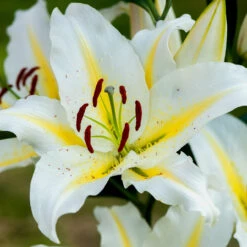 Lily bulbs will greatly appreciate the shelter of low growing shrubs or other plants near their roots. In active growth, apply water freely a high potash liquid fertilizer every two weeks or so. When planting, each bulb should surrounded with a little sharp sand both under and above the bulb to keep slugs away and to ward off excessive wetness. As most lilies are stem rooting, we strongly recommend you plant about 15cm deep. They give a much better display when planted in clumps of 3, 6 or 12 bulbs, spaced 45cm apart. Plant from December to April to see them appear in summer.
