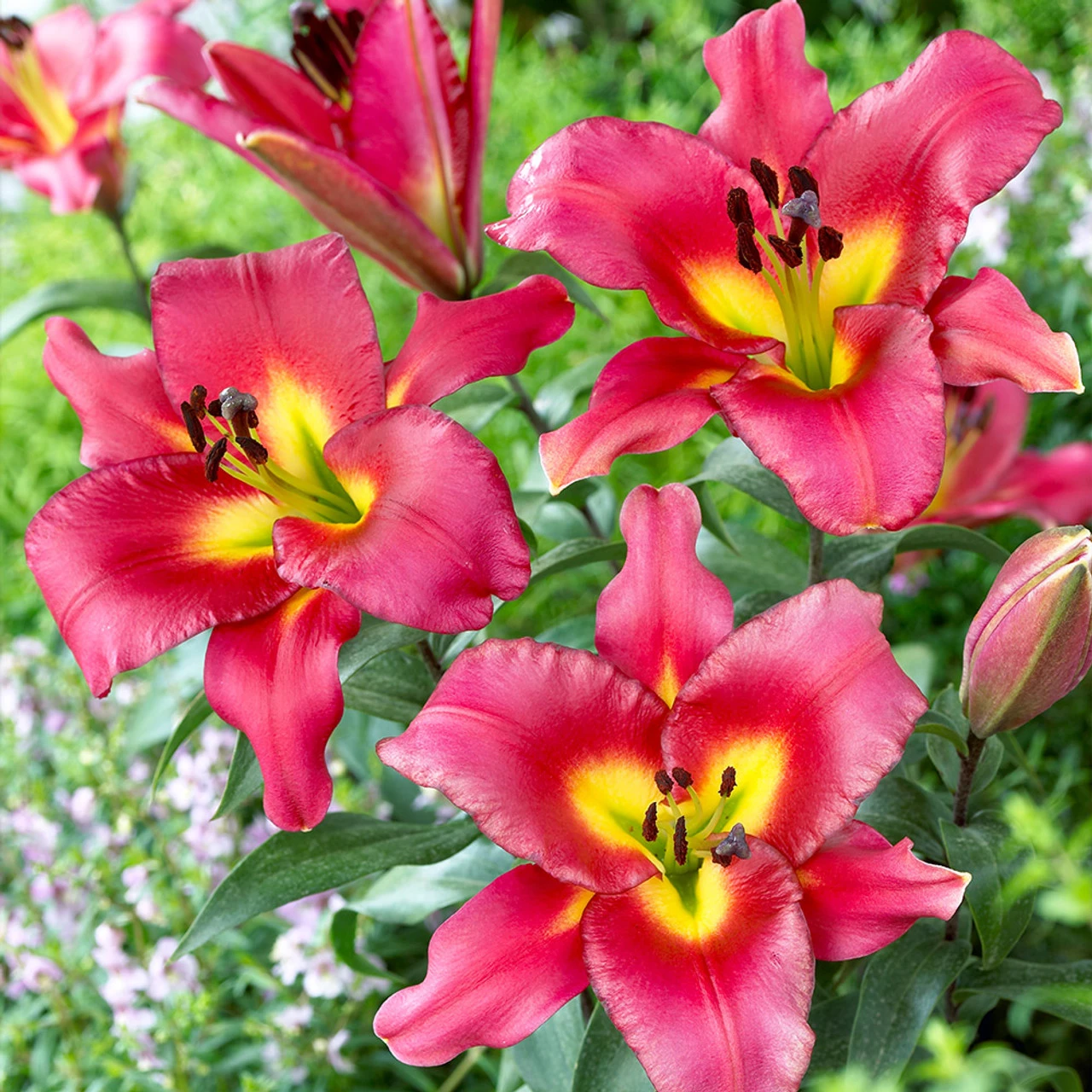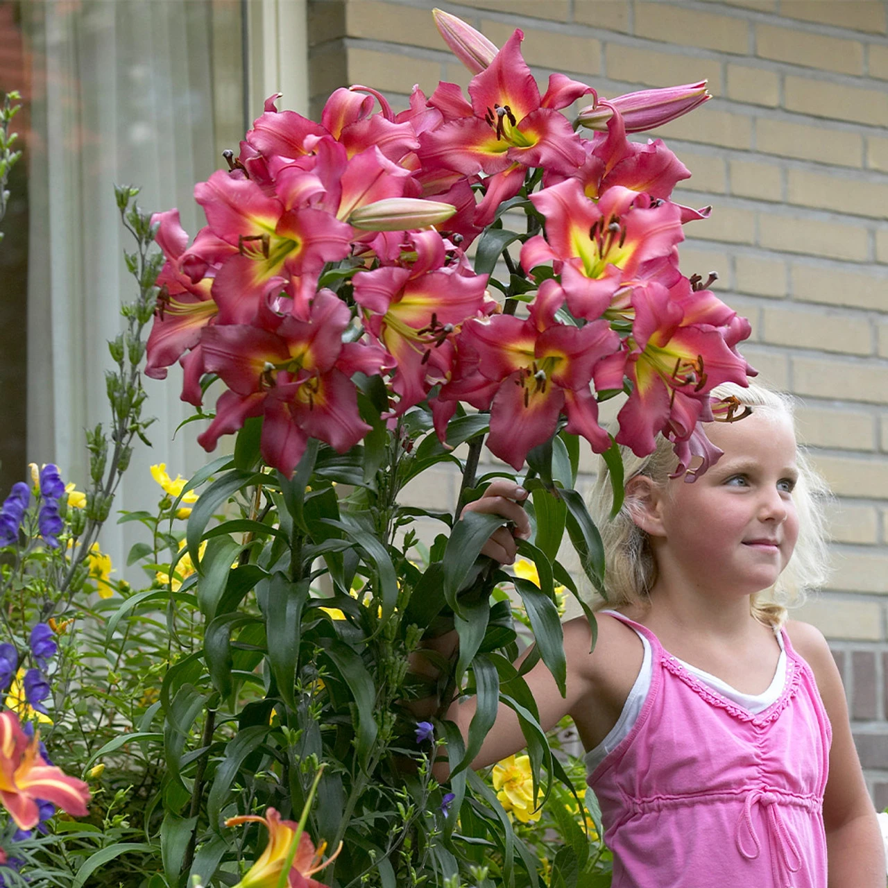 Giant pink flowers with a yellow heart. Height 120cm. Flowers June-August. Top quality 18/20cm bulbs supplied.