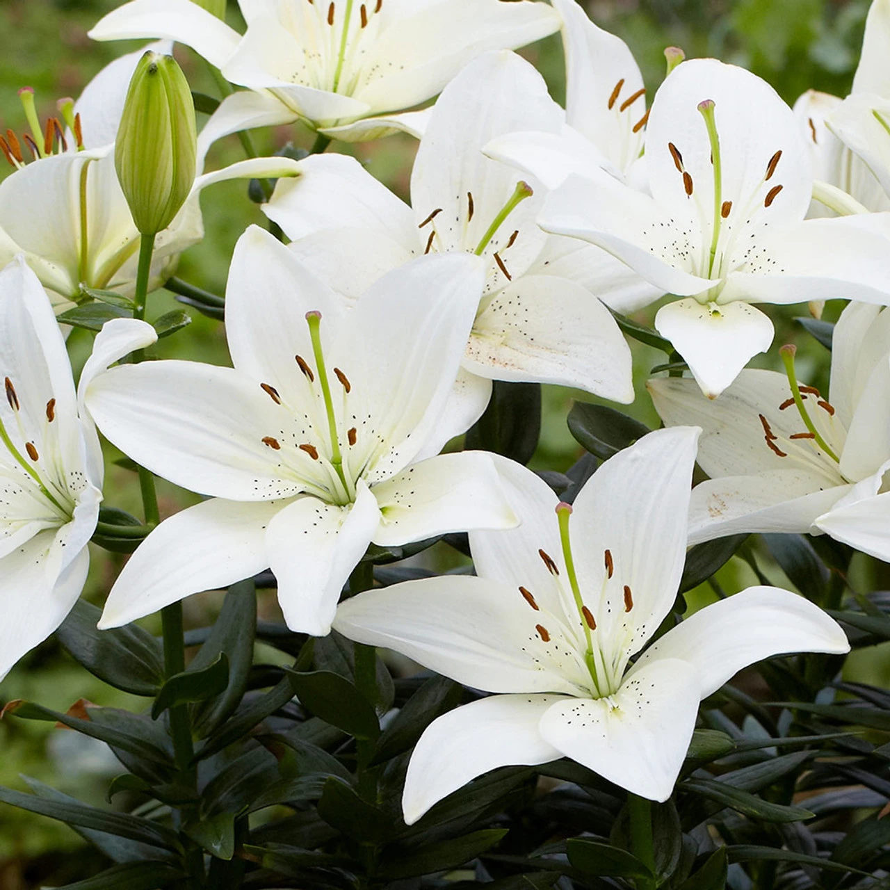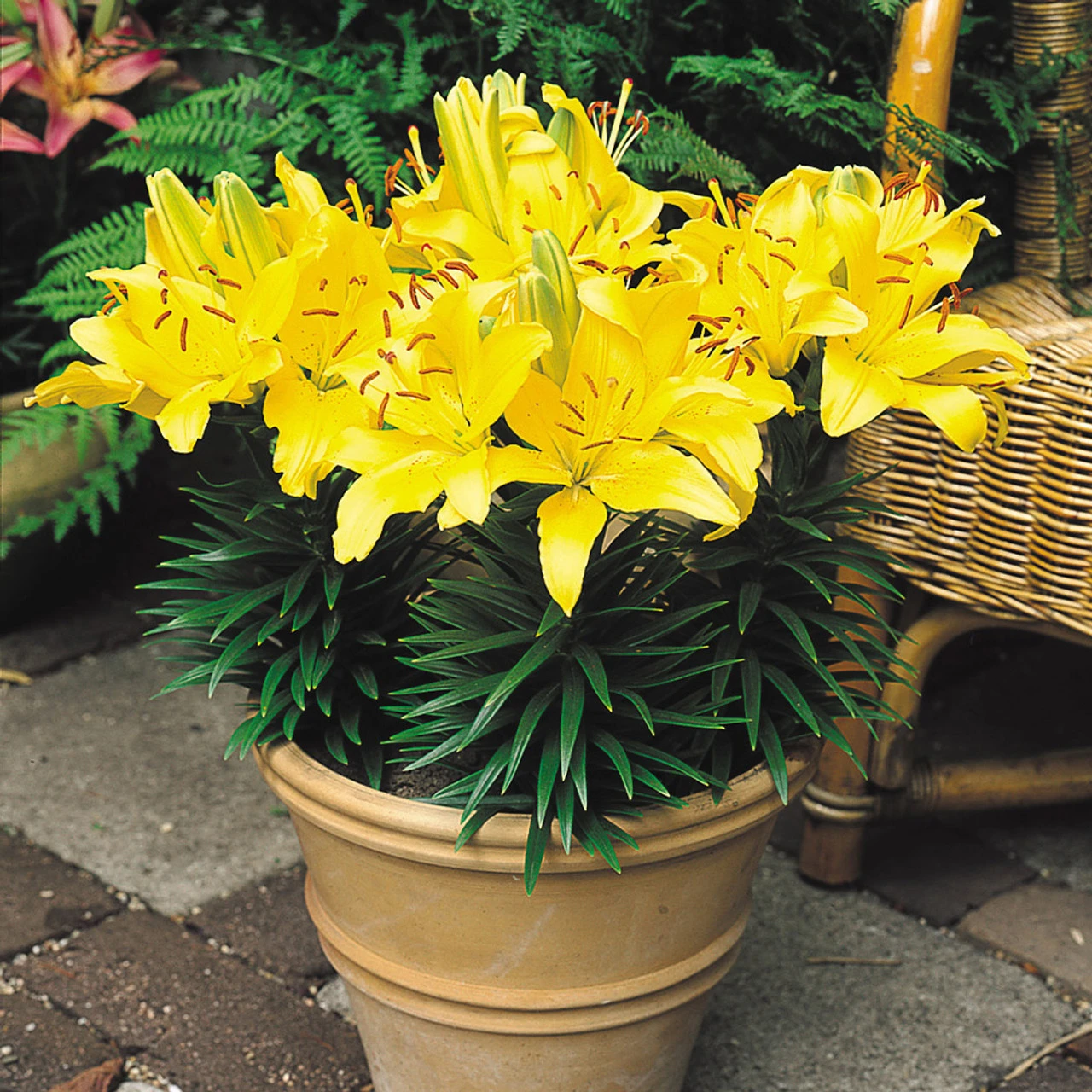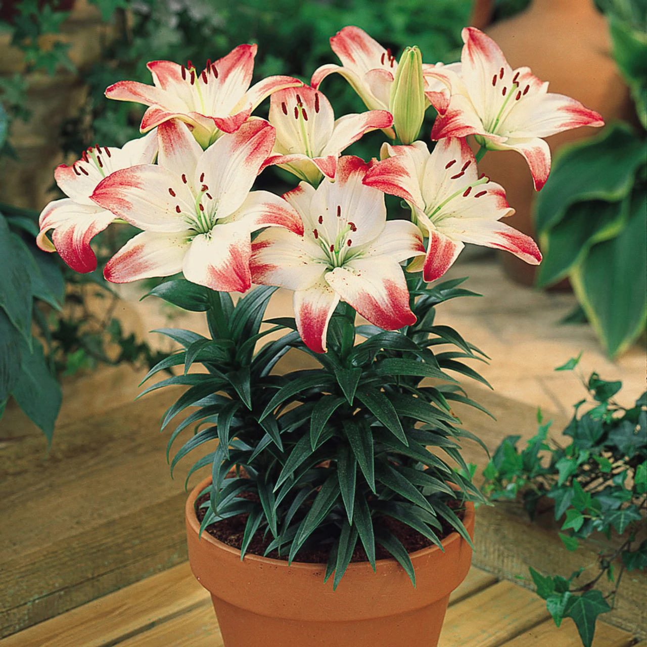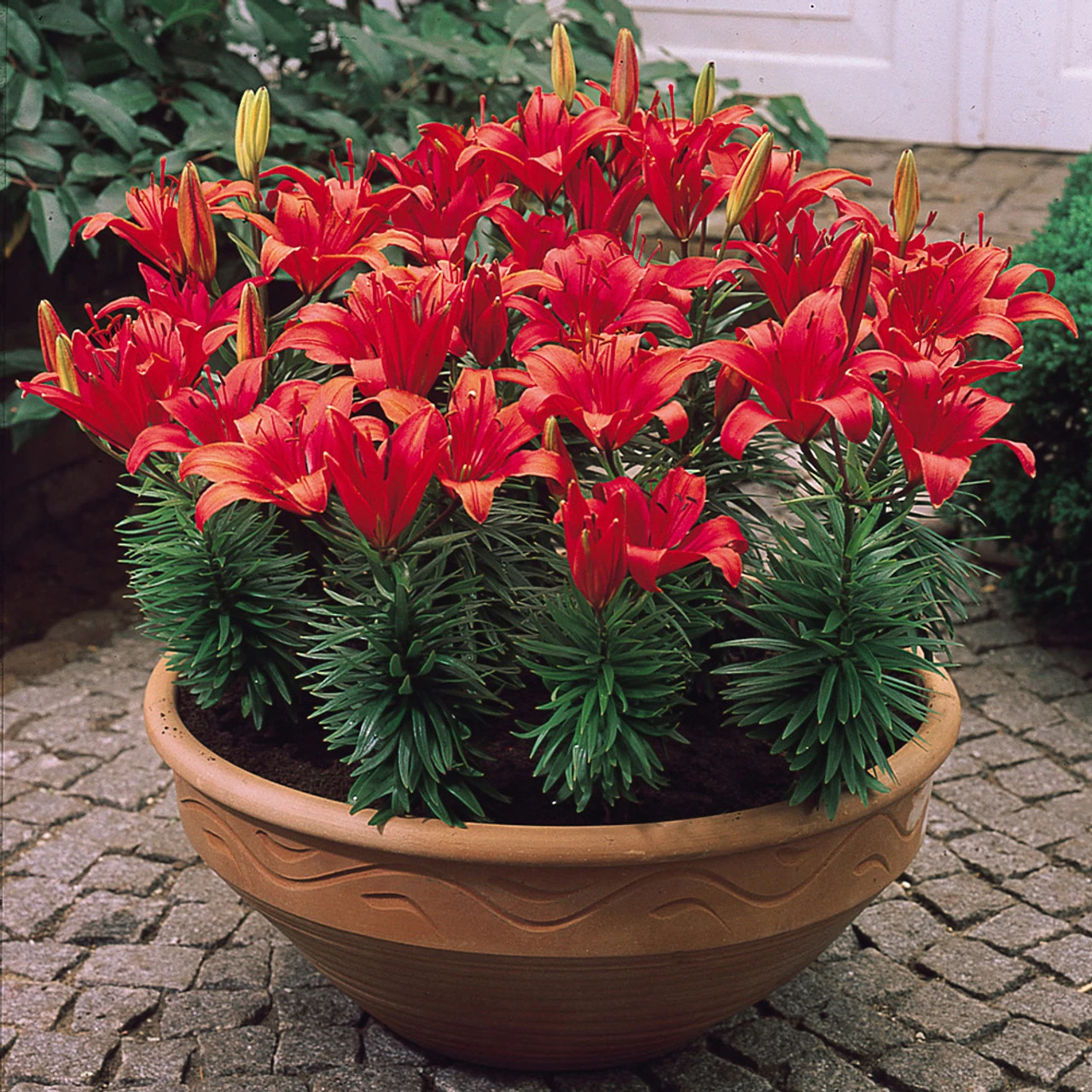 Our carefully selected range of dwarf Asiatic Lilies grow to just 30-50 cm tall, unlike most Lilies which grow over 120cm and tend to need support. They are all sturdy, self-supporting and ideal for pots, tubs or rockeries.They are also successful as part of a summer border display. The colour combination of the blooms are sure to brighten any garden, and they are fairly low maintenance.This collection includes Inuvik (white), Abeville’s Pride (orange), Red Carpet, Foxtrot (pink), Lollipop (white with pink tips) and Butter Pixie (yellow). 14/16cm bulbs supplied. Height 45cm.