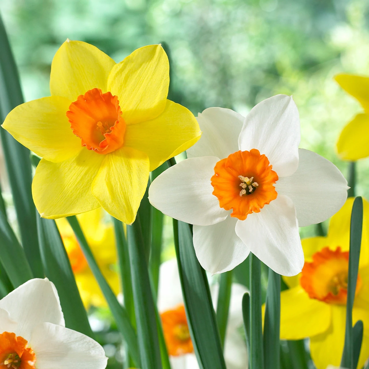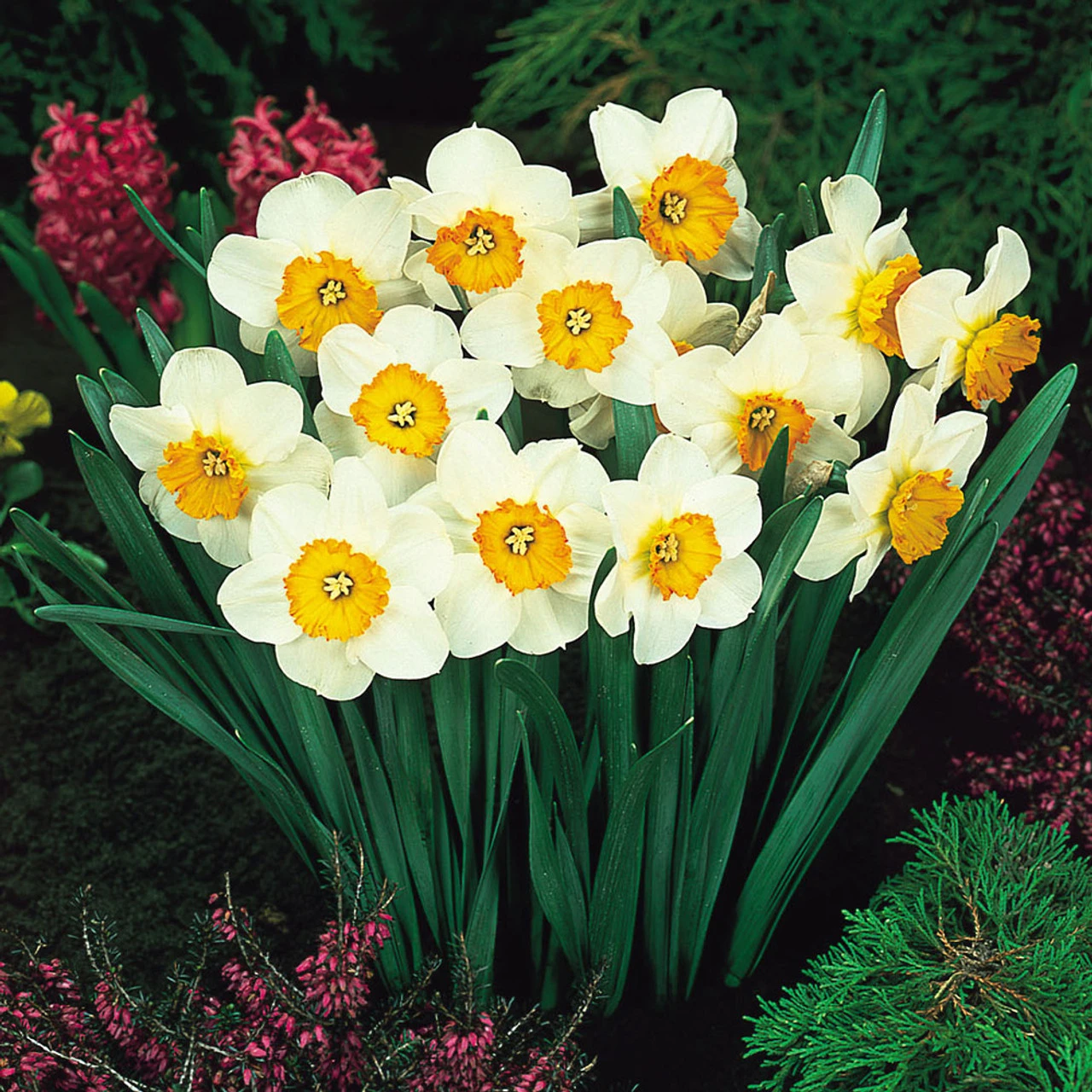 A small cupped Daffodil comprising of an overlapping pure white perianth, with a small shallow reflexed cup of vivid orange-scarlet. As with all short cupped Daffodils, Narcissus Barrett Browning is noted for its brilliance of colour and is most highly prized for cut flower displays. Daffodil Barrett Browning has the added bonus of being a great naturaliser, so are a great addition to beds and borders. Flowers April-May. Height 40cm. 12/14cm bulbs supplied.