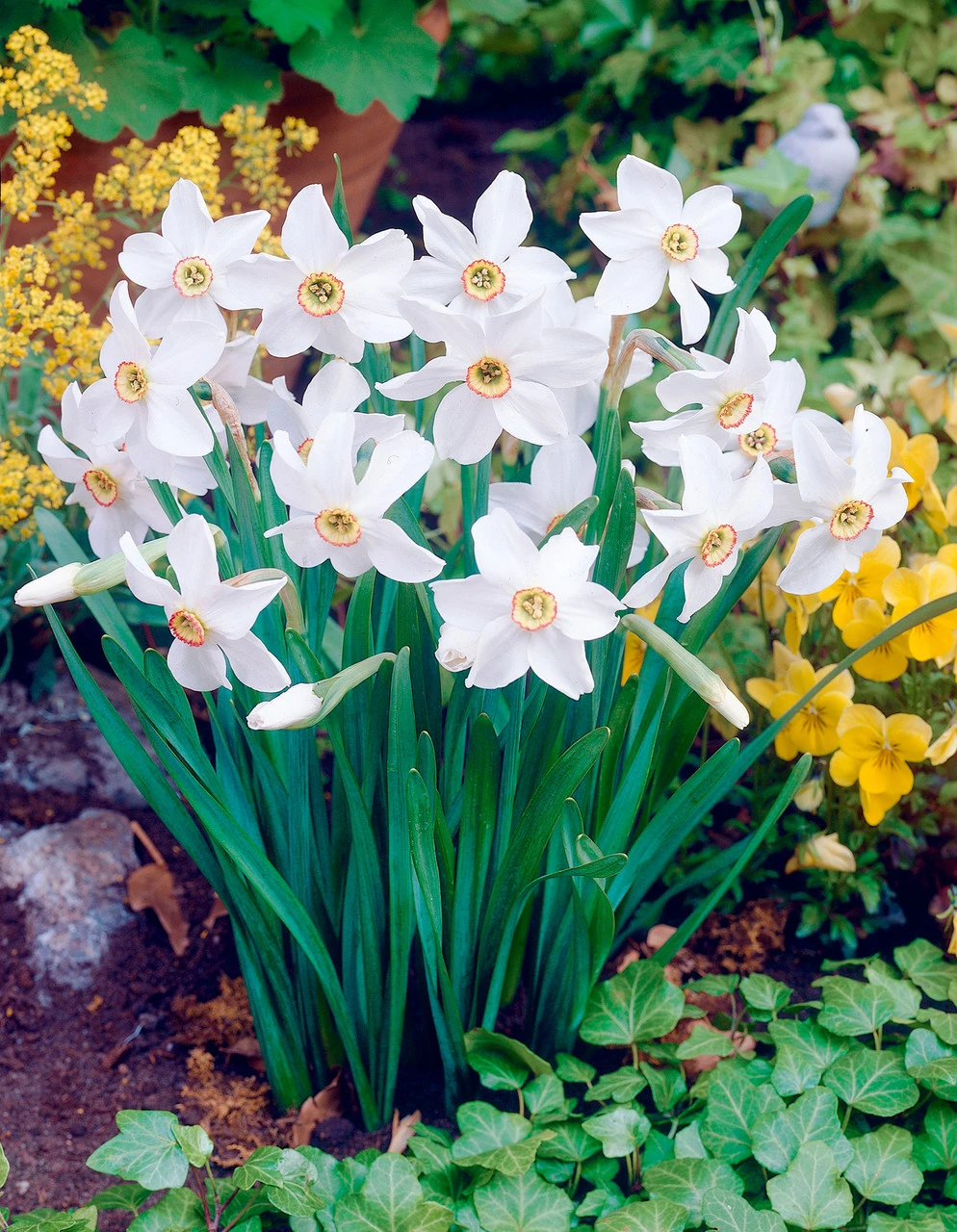 This variety is over 100 years old and will flower in late May, after many narcissi have been and gone. Narcissus Pheasant Eye is a beautiful pure white reflexed perianth, with an orange-red cup. They are often chosen because of their ability to naturalise well, creating large clusters or groups. Daffodil Pheasant Eye is perfect for borders or patio containers and they make excellent cut flowers for the vase. Height 35cm. Flowers in May. 10/12cm size bulbs supplied.