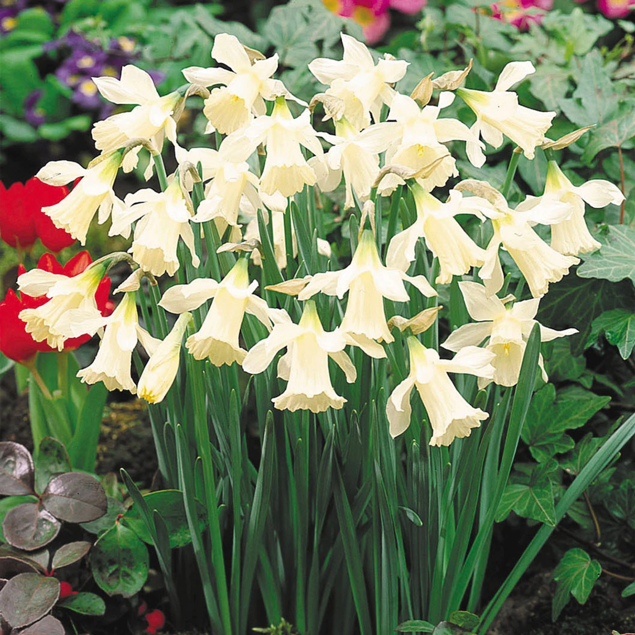 An unusual and distinctive variety that has been popular for over a century. Narcissus W P Milner produces attractive compact foliage that surrounds masses of gently nodding flowers of pale milky white with a gentle flush of straw yellow at the floral chamber. The perianth is swept forward delicately shielding the creamy white trumpet. Daffodil W P Milner is perfect for the front of the border or featured in pots and containers. 10-12cm bulbs supplied. Flowers March. Height 20cm.
