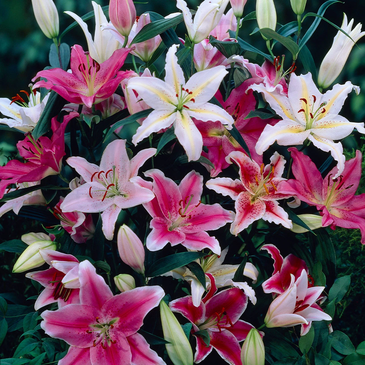 This exciting mixture of oriental lilies are highly fragrant and produce giant, star-shaped flowers in vibrant colours and fantastic markings. This mixture will add grace and beauty to your patio pots, borders and cut flower displays, where they bloom from August- September for weeks of sensational blooms.