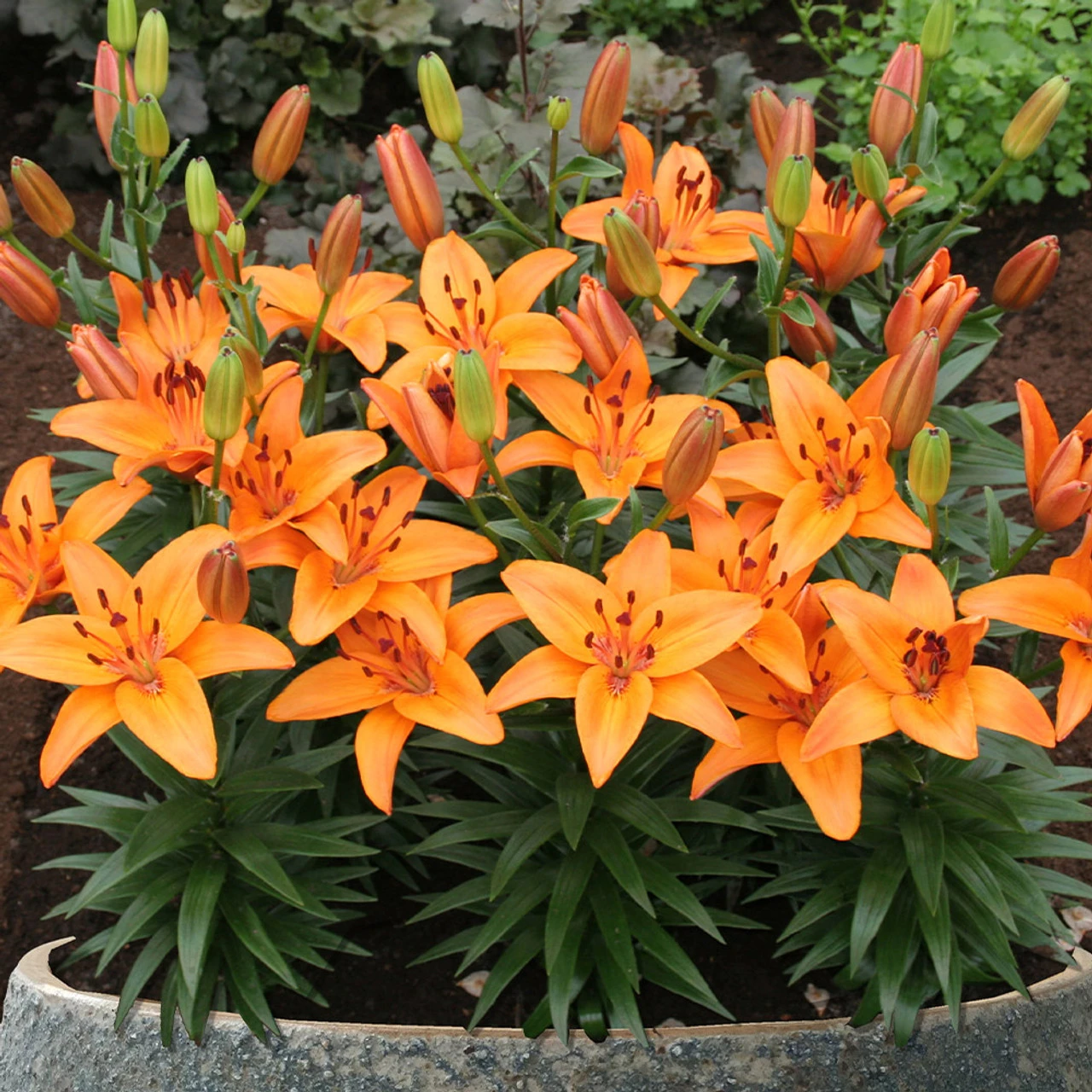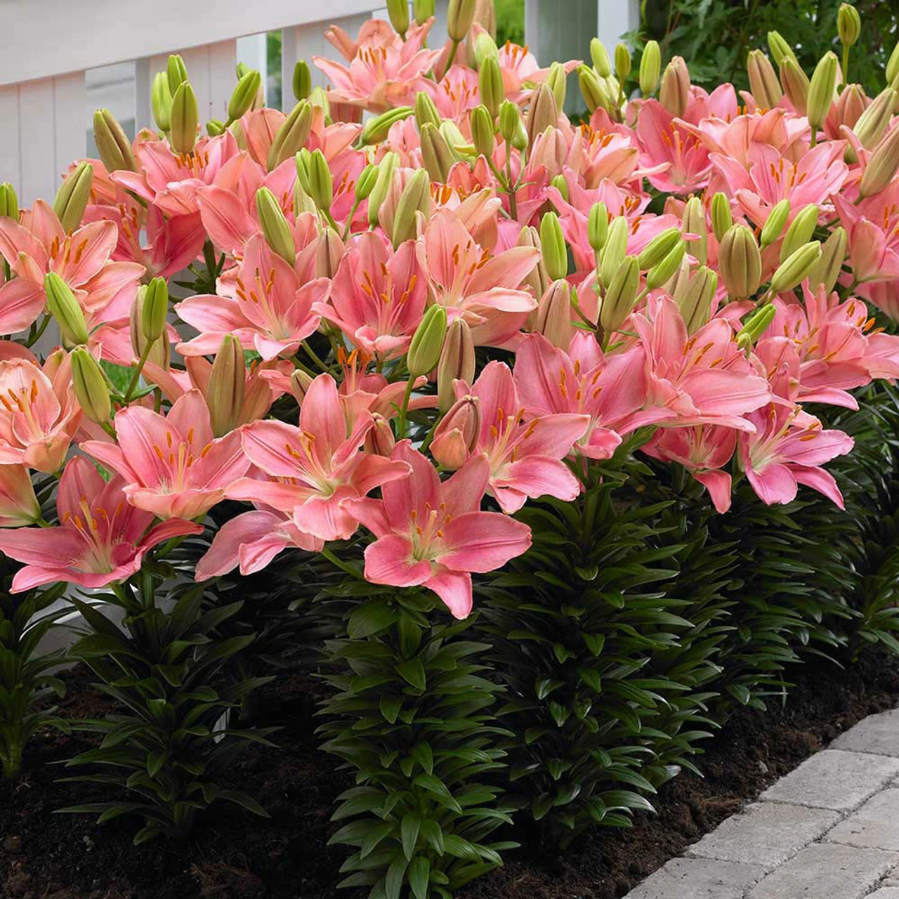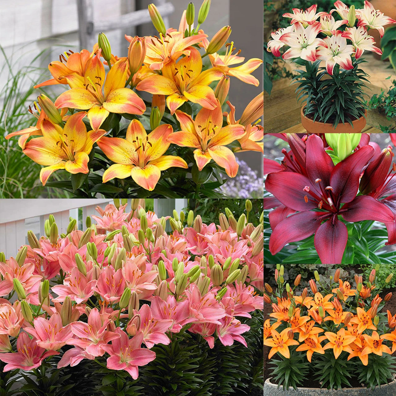 A superb collection of short stemmed Lillies, includes five each of Abbeville’s Pride (orange), Red Carpet (red), Foxtrot (pink), Happy Memories (yellow with blushes of red) and Lollipop (white with blushes of red). Height 30-40cm. Flowers June to August. Top-quality 14/16cm bulbs supplied.