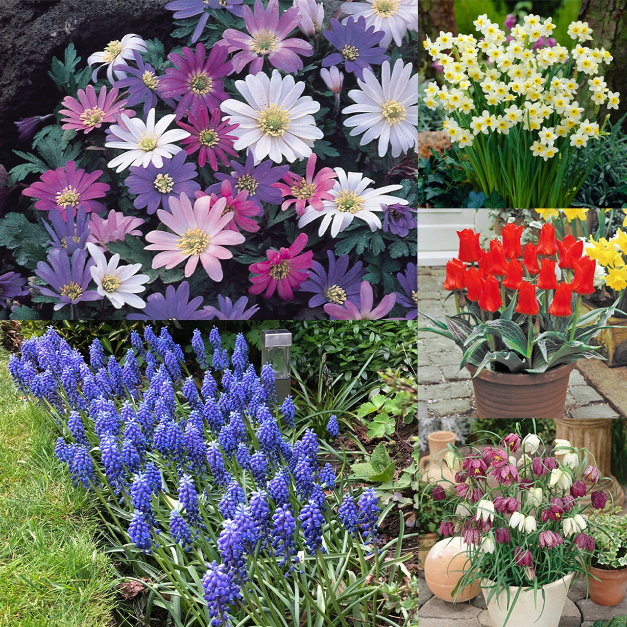 Spring Flowering Bulb Collection for a Rockery is, as you can imagine by this collection’s name, is a must for any rockery display. This variety of spring blooms will add colour and excitement to the rockery that you’ve never seen before! Collection includes 10 each of Tulip Red Riding Hood, 15 each of Narcissus Minnow, 25 each of Fritillary Meleagris, and 50 each of Anemone Blanda mixed and Muscari Armeniacum.