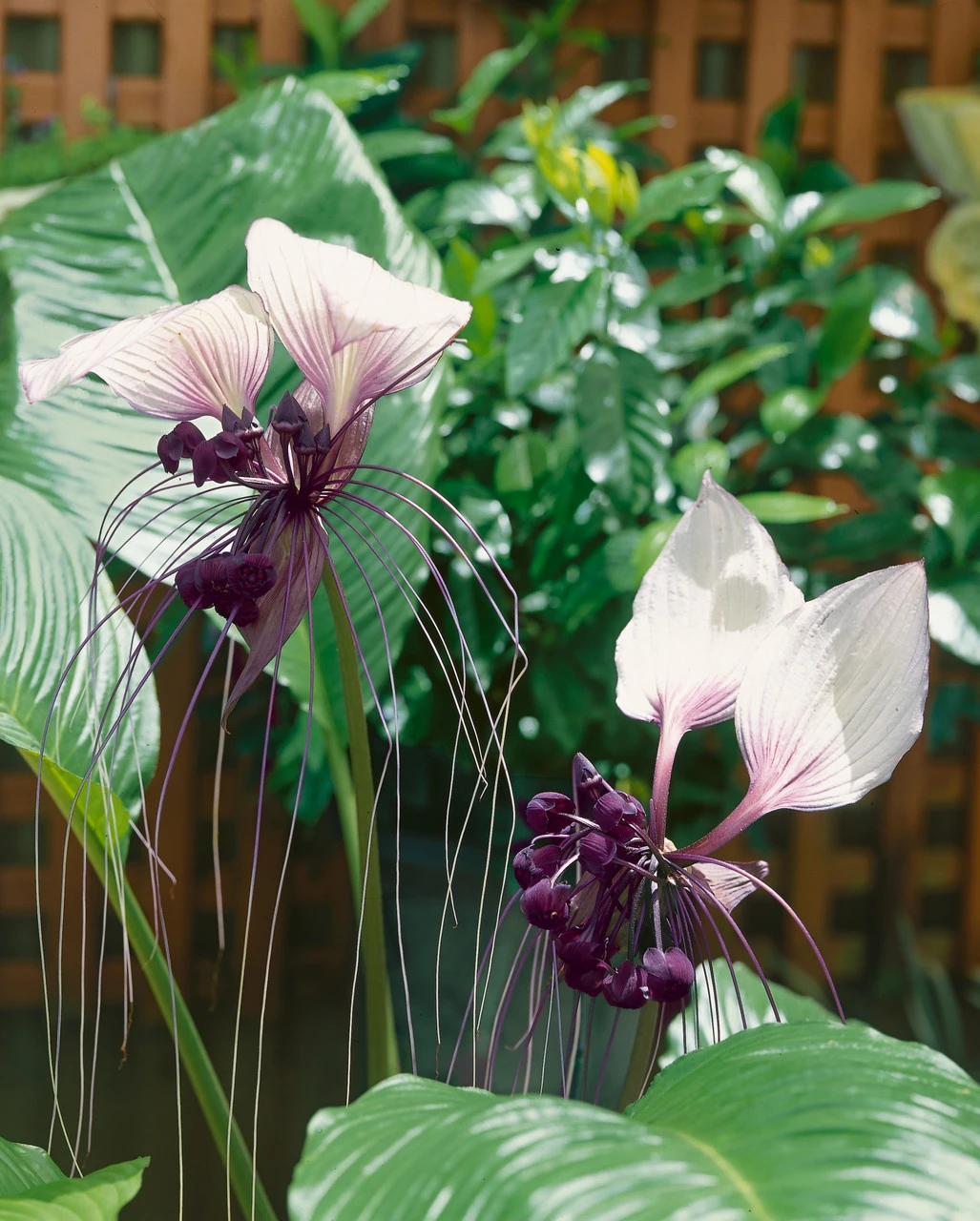 It is easy to see why these are also known as the White Bat flower. The petals are wing like in shape, brilliant white tinged with purple veins that merge into deep maroon bracts trailing whiskery filaments. Artfully suspended on thin sturdy 60-90cm stems surrounded by upright shiny elliptical leaves.As a native of the Asian rain forest where it would be found in deep shade, this plant enjoys high humidity and will need to be well watered during the growing season. Ensure a consistent temperate and moist soil, keeping out of strong winds and direct sun.Although a challenging plant to grow, this is the easiest of the bat plants to cultivate and as anyone who has fallen in love with these alien looking flowers will tell you, they are well worth the effort. First grade loose root plants or bulbs supplied.