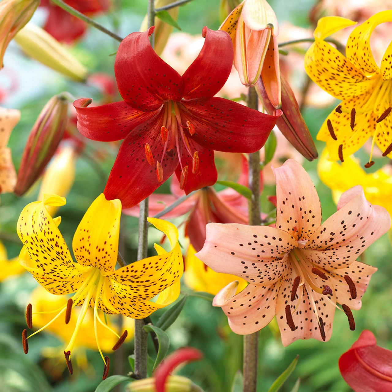 This unusual, but interesting mixture of vibrant coloured re-curved flowers, all fragrant and heavily speckled throughout with small black dots. Great for flower beds, borders where the tall 120cm stems can easily catch the eye. The name Tiger refers to the spots inside the petals. This Lilium will grow on firm stems and if planted deep enough can be left there as they will naturalise easily to flower. 14/16cm bulbs are supplied.