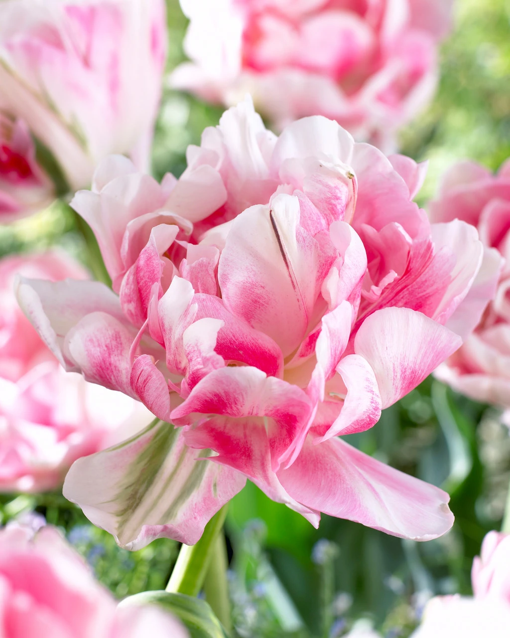 Tulip Finola is a beautiful new double variety that produces pretty pink and white flowers. It works very well with other colours, especially contrasting darker shades to create an eye-catching display within the garden and patio containers. They will also look beautiful in a vase within the home as part of a cut-flower display.