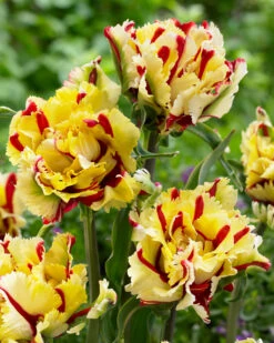 Tulip Flaming Parrot is a unique and exciting variety that boasts large, flared heads with intricately feathered edges. Each petal twists and turns artistically, showcasing a stark yellow striped with red. Tulip Flaming Parrot is a parrot tulip which is hard to ignore and sure to impress this spring. Each flower head sits on a tall sturdy stem, surrounded by lance-shaped foliage. This tulip not only looks good in pots or the border but is perfect for cut flower displays.