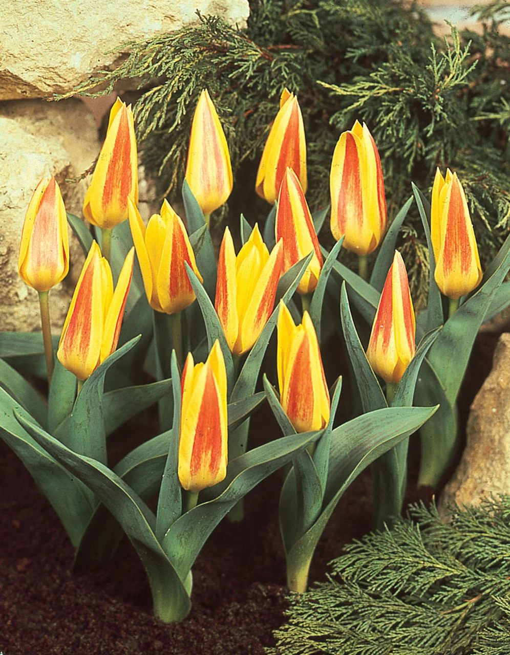 Tulip Giuseppe Verdi is a striking Kaufmanniana Tulip that will add some colour and cheer to your spring display. From April to May, it will produce dainty golden yellow flowers with unique vivid red stripes down the centre of each petal. Growing to a height of only 20cm, this dwarf Tulip will add a small burst of colour to patio pots, rockeries and the front of borders.