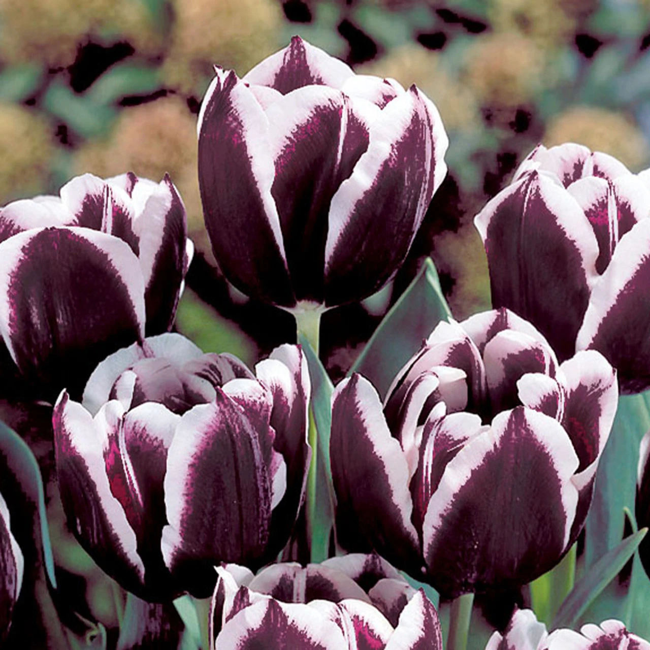 Tulip Jackpot is the first of its kind, the closest to a black and white tulip in existence. Exciting dark mahogany-grape petals form this full bodied Triumph variety. Each petal sports a broad white band at its edge, the whole bloom settled on a white base supported on silvery grey-green 45cm stems. These unique Tulips make a beautiful cut-flower display that can be enjoyed within the home. 11cm+ bulbs supplied.