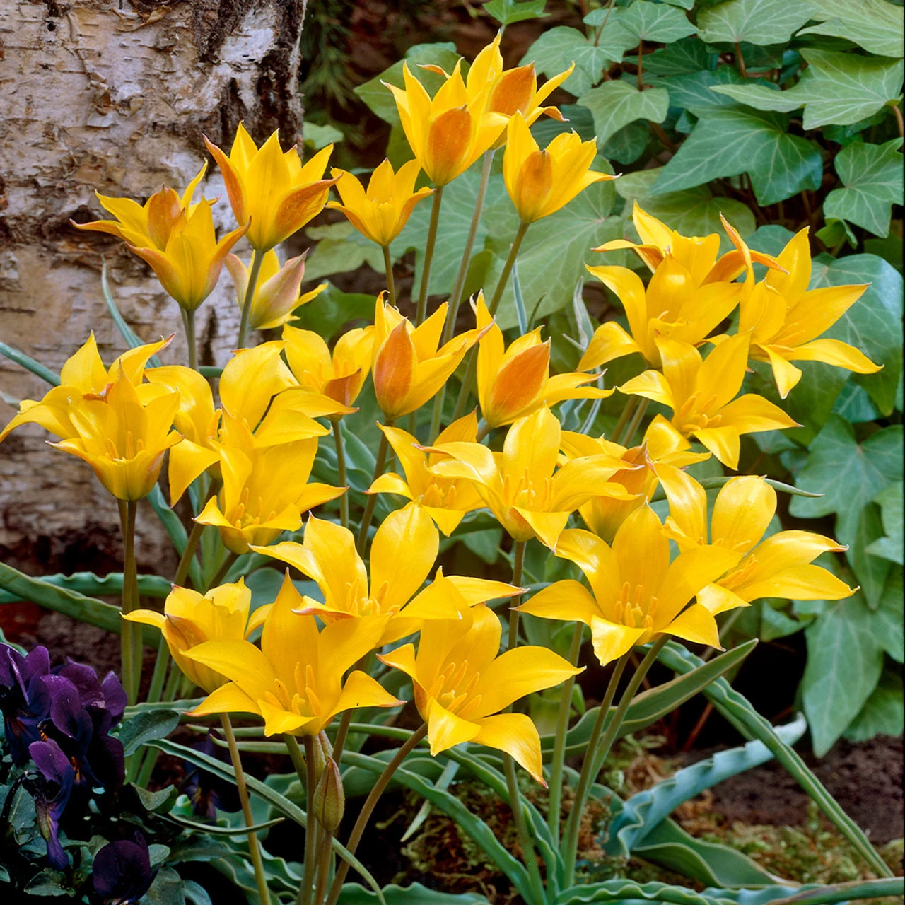 Tulip Kolpakowskiana is a superb species tulip. Produces golden yellow blooms with broad carmine-red stripes and deep green foliage. 6cm+ bulbs supplied.