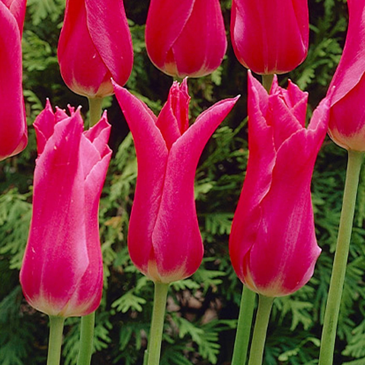 Mariette is tall, slender Tulip with long-lasting reflexed flowers from late April-May. This Lily flowering Tulip, which is also known as a Fluted Tulip, will add much elegance to your spring garden. Great when planted alongside contrasting colours to create a maximum effect in garden borders, patio container and works perfect in cut-flower displays. Plant 10-15cm deep in well-drained soil and choose between a sunny or partially shaded location. This variety reaches 55cm and boasts a sturdy green stem, however choose a wind-sheltered position where possible to avoid damage. 10-11cm bulbs are supplied.