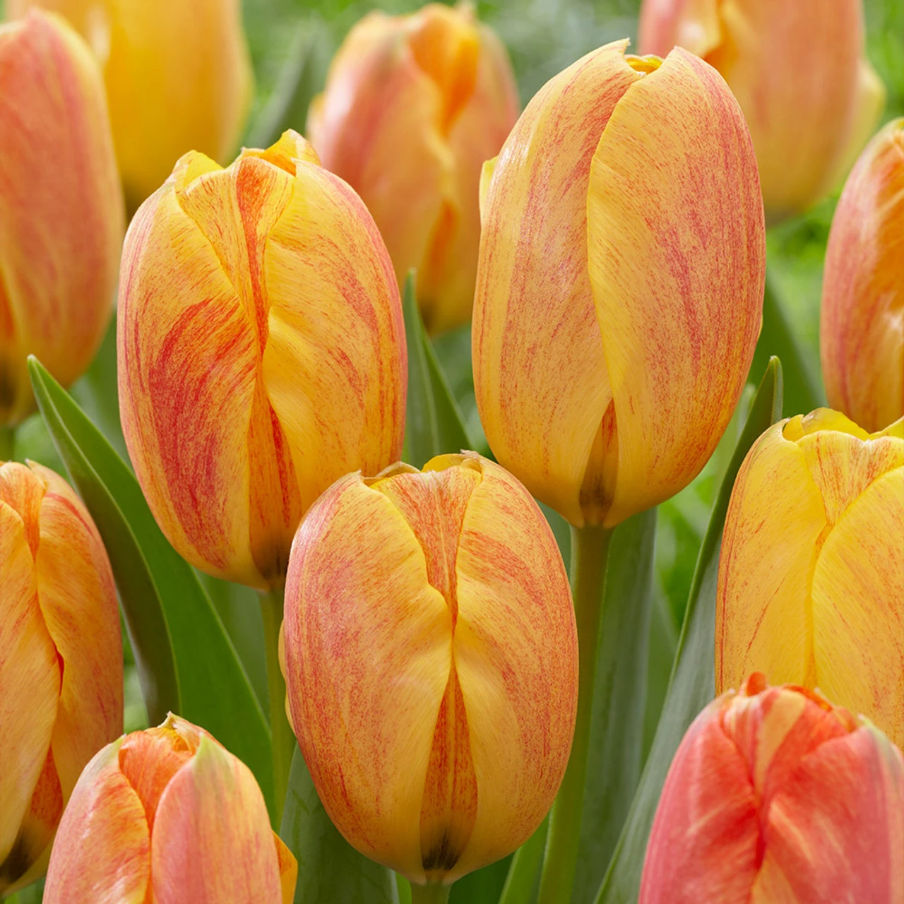 Tulip Rhapsody of Smile is a spectacular yellow variety with variable red flames.