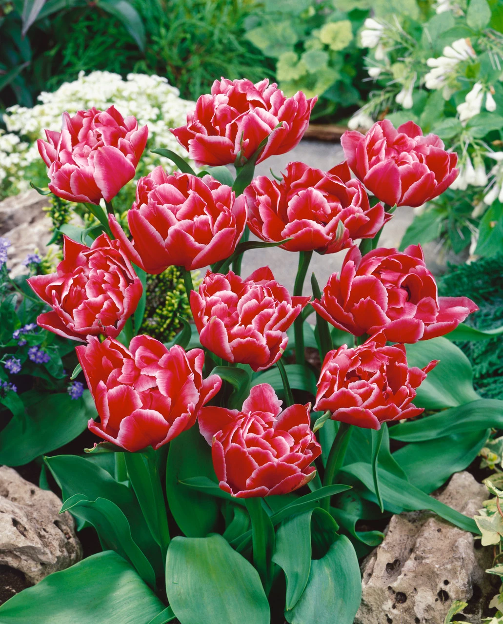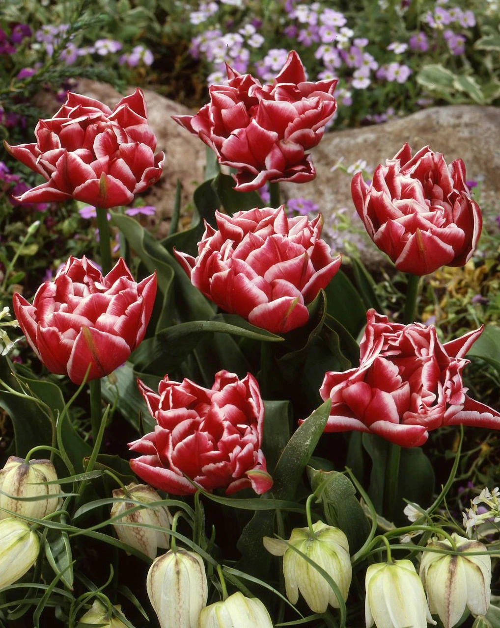 A double flowering variety with massive Peony like flower heads. Sumptuous slightly ruffled petals of carmine-rose edged in white. These will grow to 30cm and as you can see illustrated here they blend beautifully when planted along sideWilliam of Orange (bright orange) in the bed or border. Supplied as 11-12cm bulbs.