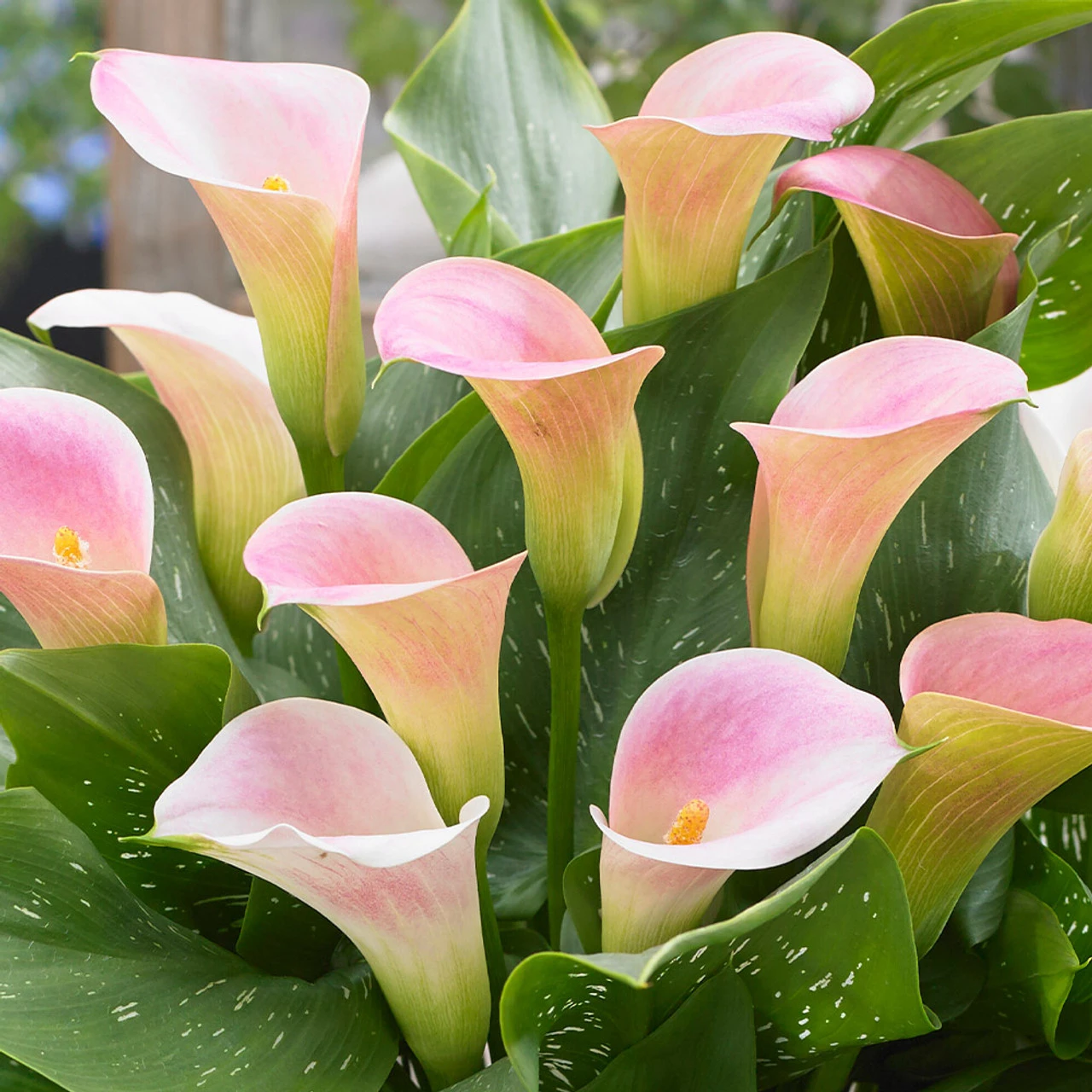 Zantedeschia Captain Marrero is an elegant variety that produces funnel-shaped flowers in shades of baby pink, white, and even green at the base of each flower. The large mottled leaves also add to the overall aesthetic, which will look sensational in the border or a container.